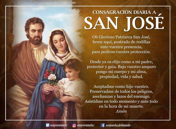 Oh glorioso San José, modelo de todos los padres y esposos, te veneramos en este día especial en que celebramos tu festividad. Tú que fuiste fiel custodio de la Sagrada Familia, te pedimos que nos protejas y acompañes en nuestro camino de fe.